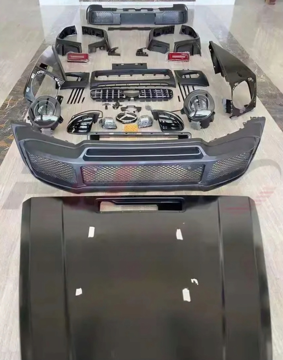Das Frontpaket besteht in der Regel aus Scheinwerfern, einer Frontstoßstange, Kühlergrills, Spoilern und Splittern, einer Motorhaube und Scheinwerferabdeckungen.